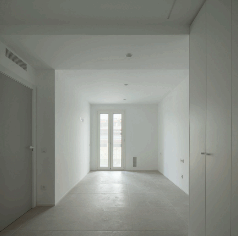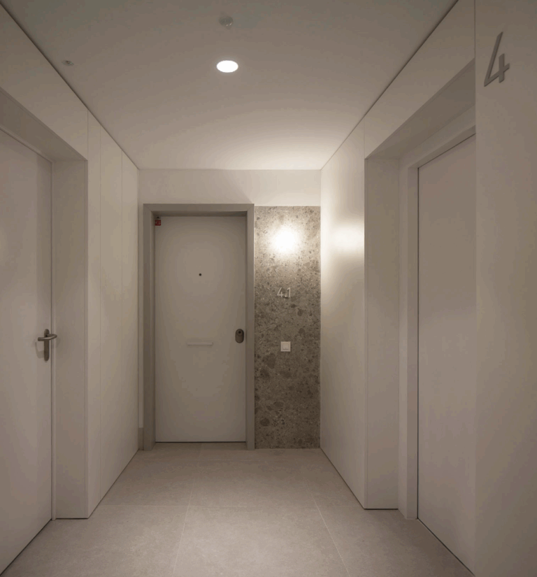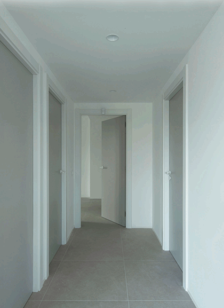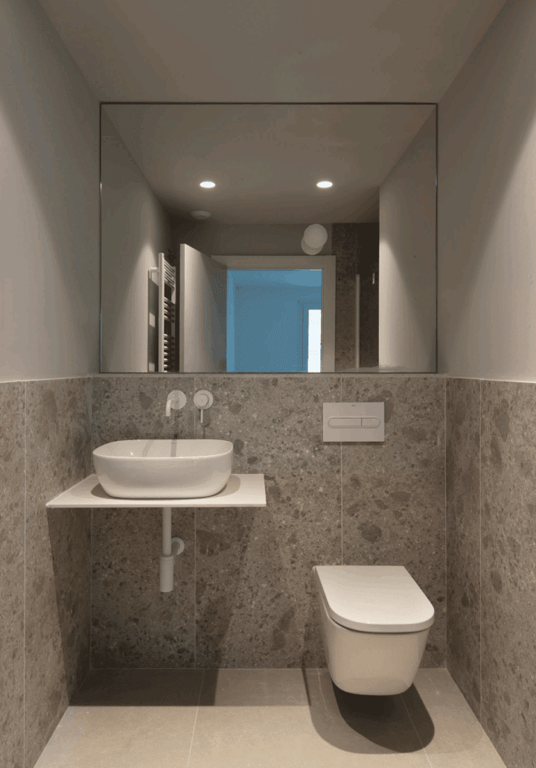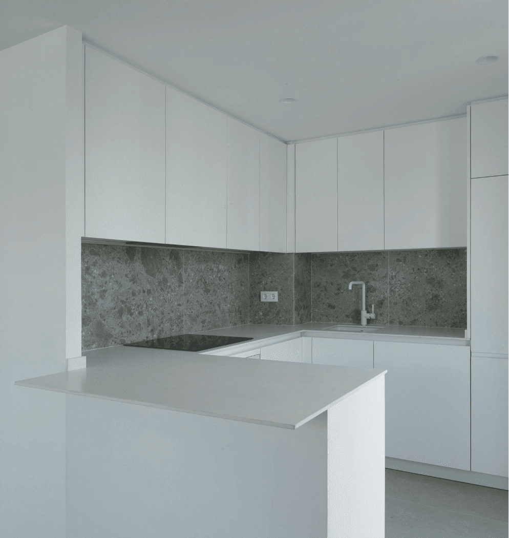 Pavimentos porcelánicos de gran formato, a excepción de los baños, donde se colocarán pavimentos y revestimientos de color gris claro.
