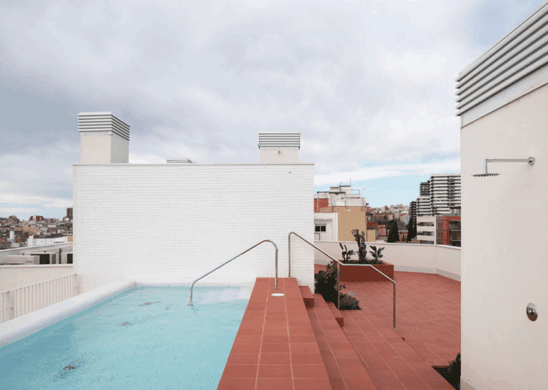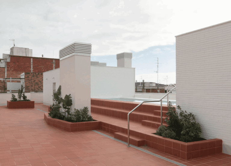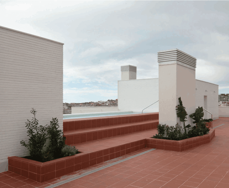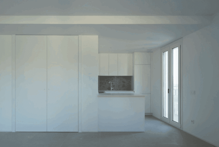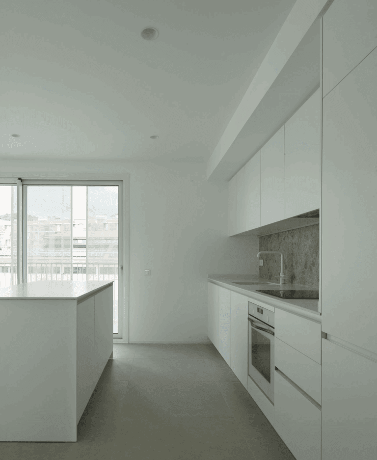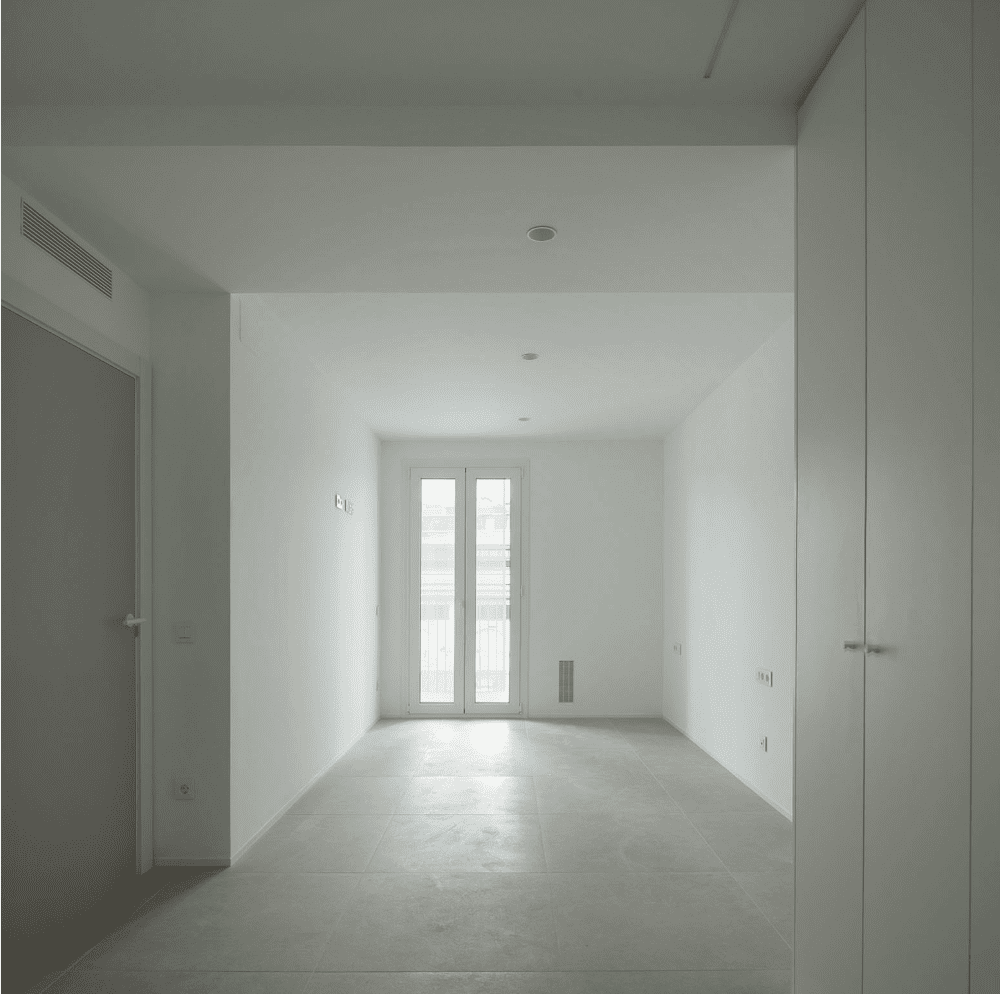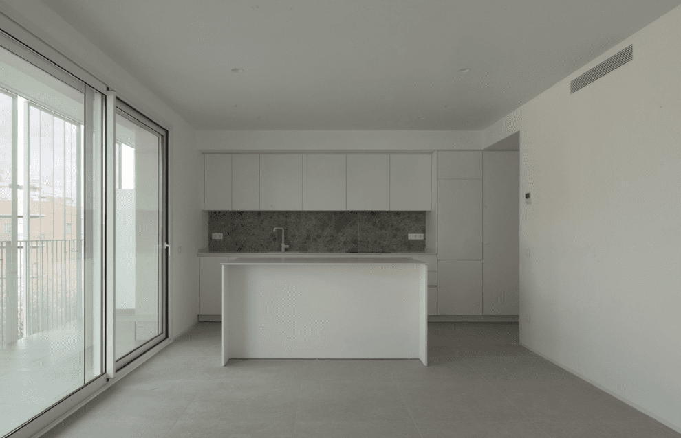 Pavimentos porcelánicos de gran formato, a excepción de los baños, donde se colocarán pavimentos y revestimientos de color gris claro.